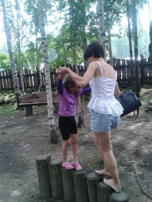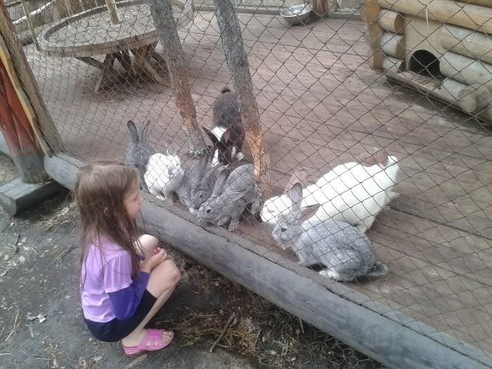 на входе есть кафе, там всё очень здорово сделано из дерева - мостки, фигуры всякие самые разные. Свете оч нравится. там же загон с кроликами, на них можно полюбоваться (успела поймать Светку за попыткой освободить кроликов , она уже вот-вот и открыла бы щеколду, я уже с ужасом представила, как я буду с Кемпингом за всех этих кроликов расплачиваться - они же породистые все, их там штук десять). рядом детская площадка - качели, лазилки, горка, машинка деревянная) в общем, нескучно вот такой клондайк мы открыли для Светки