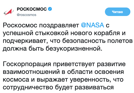 «Роскосмос» не смог сдержать раздражение и поздравил со стыковкой нового корабля только @NASA, не упомянув @SpaceX, хотя Crew Dragon ее собственность, и вся миссия DEMO-1 управляется из Хоторна.