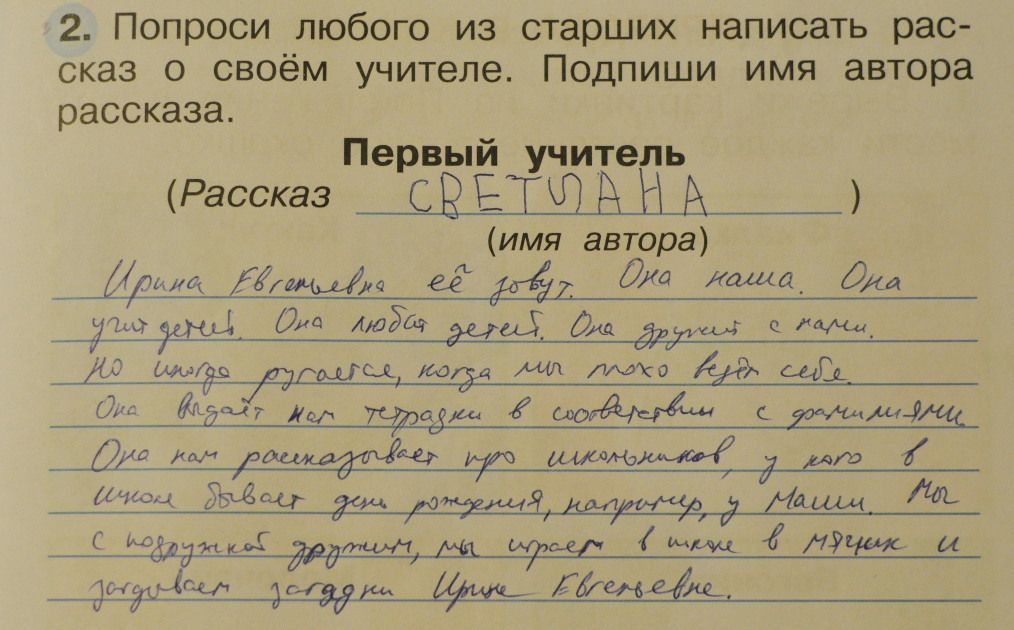 Лина!Там задание старшим об ИХ первом учителе написать,т.е. о мамином,папином или бабушкином,а не о светином с её слов.