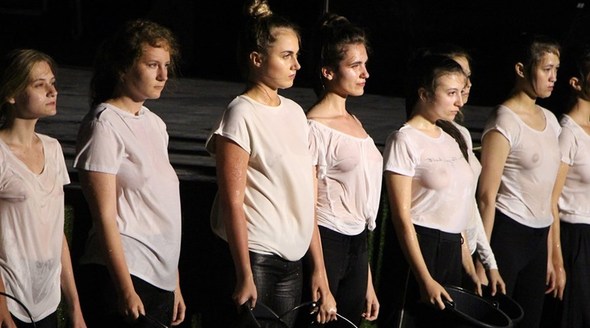 «Эпатажно, однозначно, наотмашь. Тут тебе и статьи Конституции РФ, и стихи, и видео, и пластические этюды, и мокрые майки девушек с обливанием водой (без белья…), и поцелуи страсть какие жаркие среди пар барышень с переменами партнёрш, а после в пару стали сходиться два парня... Зал замер, реальный саспенс