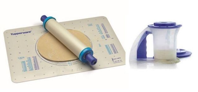 У меня таппер скалка с подложкой и пельменница. К подложке тесто не липнет, в скалку можно наливать воду холодную или горячую в зависимости от теста. В пельменнице размерчик маловат, а в остальном всё ок.